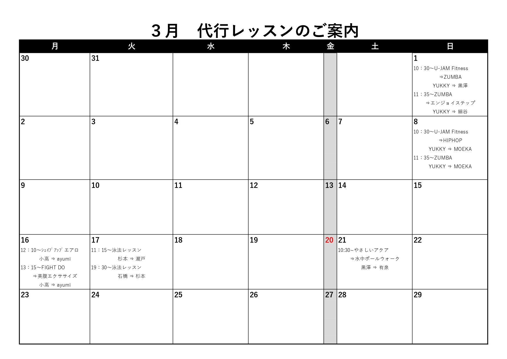 下記レッスンがインストラクターの都合により代行となります。